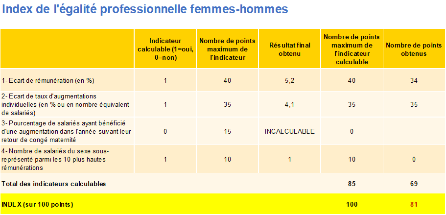 Instauré par la loi « Pour la liberté de choisir son avenir professionnel » du 5 septembre 2018, l’index Egalité Professionnelle détermine une note globale sur 100 (à minima 75 points) permettant d’évaluer la situation professionnelle et salariale des femmes et des hommes au sein de l’entreprise.